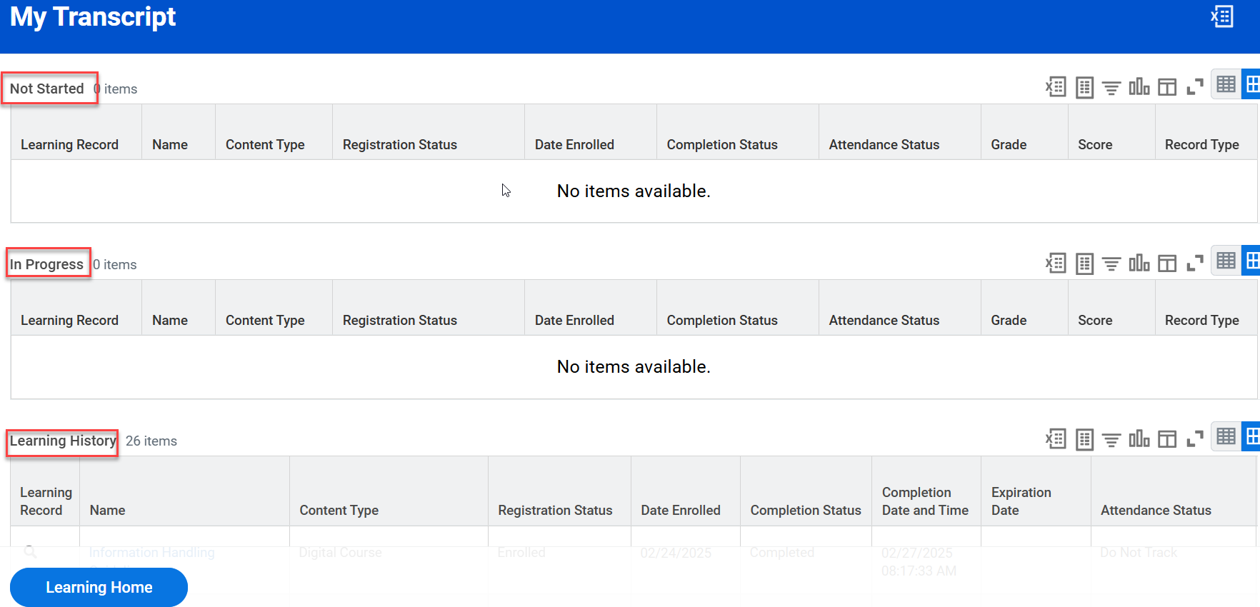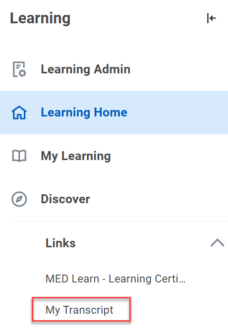 - On the Learning menu, select My Transcript