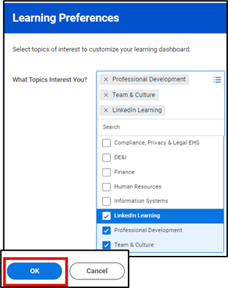 - Select the Topics that interest you so that your dashboard will show recommended courses based on your preferences.