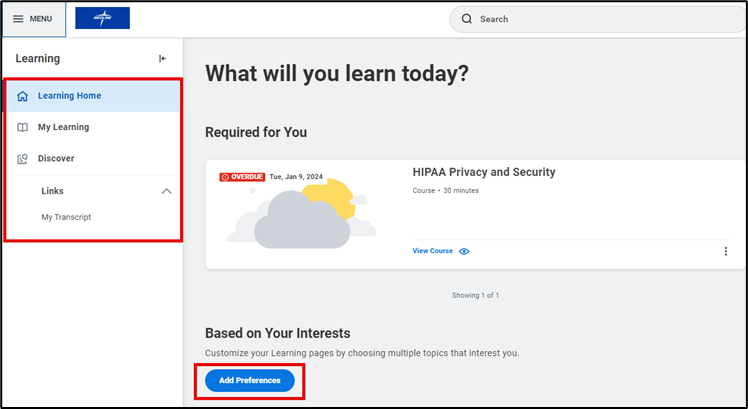 - The Learning Home dashboard displays. In the Required for You section, you will see mandatory courses that have been assigned to you.