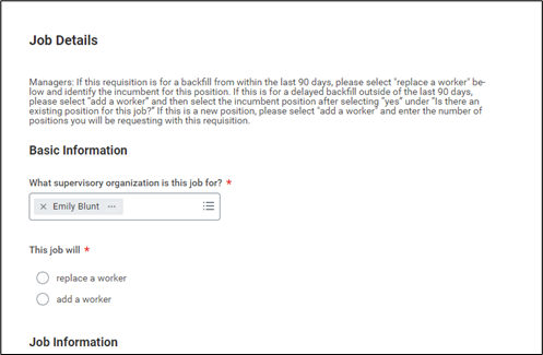 - If you select add a worker, please indicate if an existing position for this job already exists. If so, select the existing posting for this job. If no, enter how many openings there are for this job.