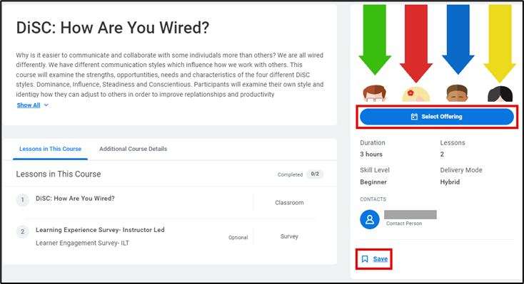 - From the Learning app, select a course that interests you from your Discover tab or Based on Your Interests recommended courses. The course details will display, including Lessons in This Course, Duration, and Delivery Mode.