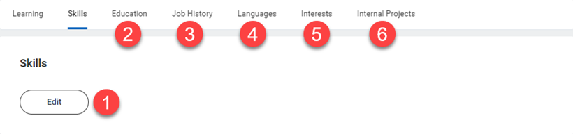 - On the Skills sub-tab, click the Edit button to add skills that represent your knowledge or ability. The other sub-tabs are modified similarly.
