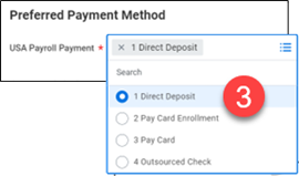 - Select or update your Preferred Payment Method. For example, 1 Direct Deposit.