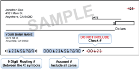 - Enter or update your Account information. See the sample check for an example of the required fields.