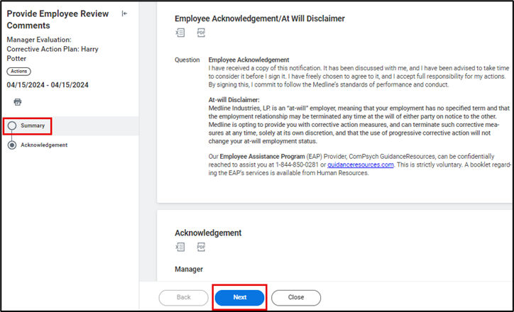 - Review the corrective action Summary, including Action Level, Action Details, Duration, Supporting Documents, Employee Acknowledgment/At Will Disclaimer and Acknowledgement. Then, click Next.