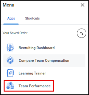 To get started, click on the Menu icon in the top left-hand corner of your Workday Homepage. Then, select the Team Performance application.