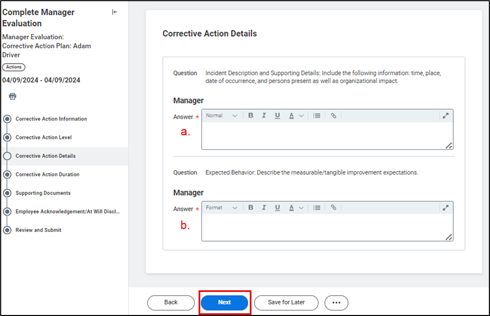 - Enter the Corrective Action Details in the a. and b. Answer fields. Then, click Next.