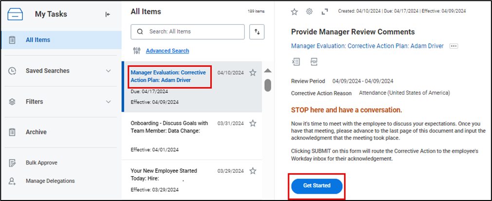 - After you have the meeting with your employee, come back to the task and click Get Started.