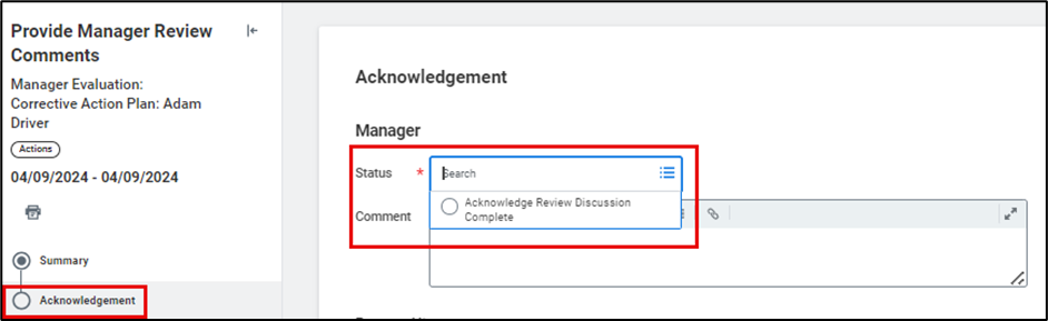 Advance to the Acknowledgement section of the task then change the Status to Acknowledge Review Discussion Complete. Then, click Submit at the bottom of the screen.