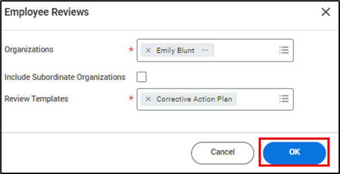 - Next, select your Organization. Then, select Corrective Action Plan from the Review Templates drop-down menu.