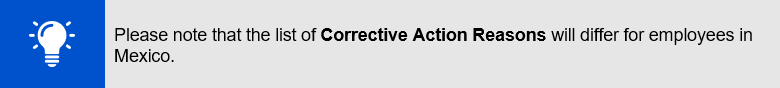 - From the Corrective Action Reasons drop-down menu, select Reasons for Employee’s Country, then the employee’s country, then the applicable reason and sub-reason for the corrective action: