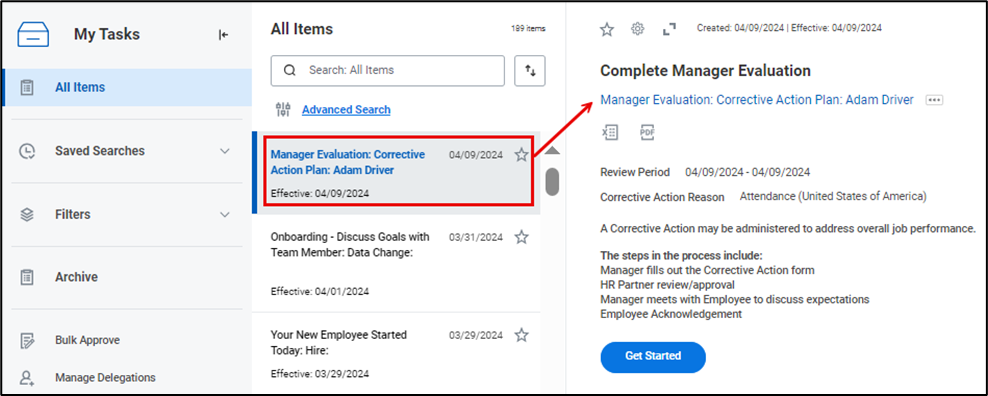 - You will receive a task titled “Manager Evaluation: Corrective Action Plan” in your My Tasks Inbox. Click the task to open its details on the right-hand side of the screen.