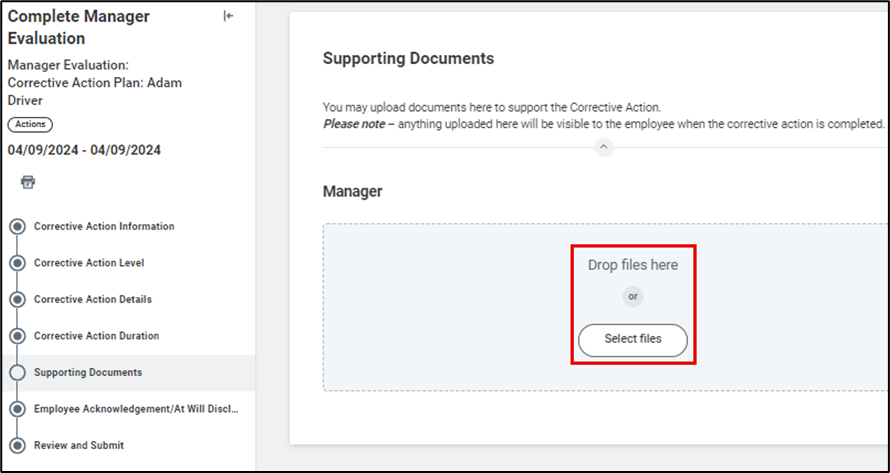- Upload any Supporting Documents by either clicking Select files then selecting the applicable file, or by dragging and dropping the applicable file into the grey box.