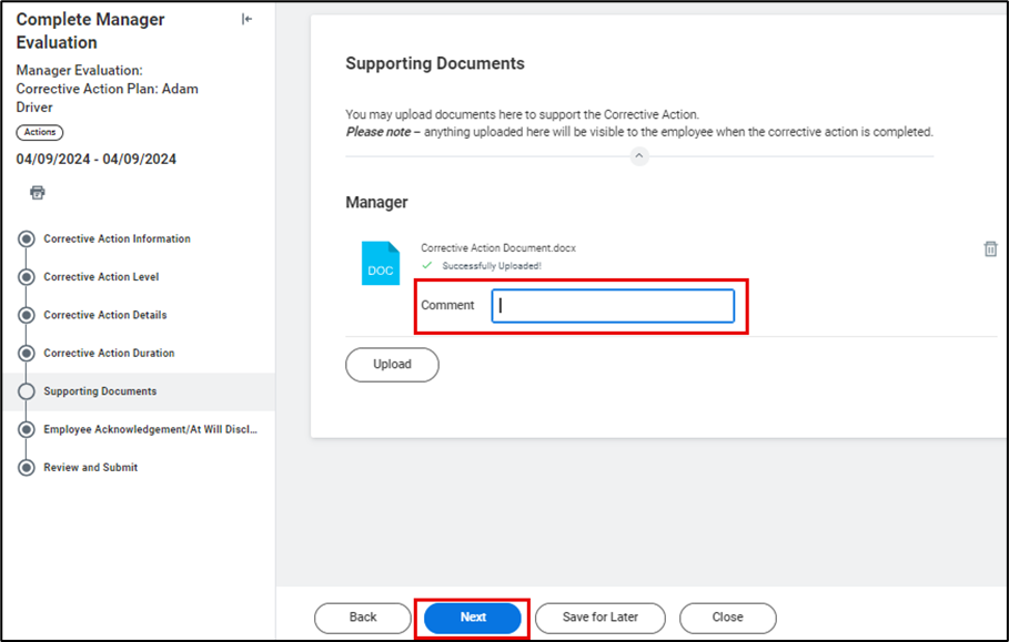 - Once the file is uploaded you can leave a supporting Comment if you wish. When you are done, click Next.