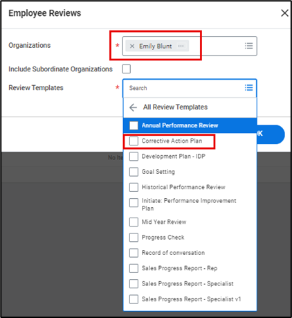 - Next, select your Organization. Then, select Corrective Action Plan from the Review Templates drop-down menu.