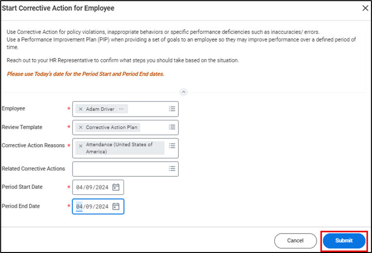 As a Manager, you are able to initiate Corrective Actions in Workday. Corrective Actions are used for policy violations, inappropriate behaviors or specific performance deficiencies such as inaccuracies/ errors. Performance Improvement Plans (PIPs) are used when providing a set of goals to an employee so they may improve performance over a defined period of time. Please each out to your HR Representative to confirm what steps you should take based on the situation.