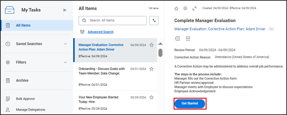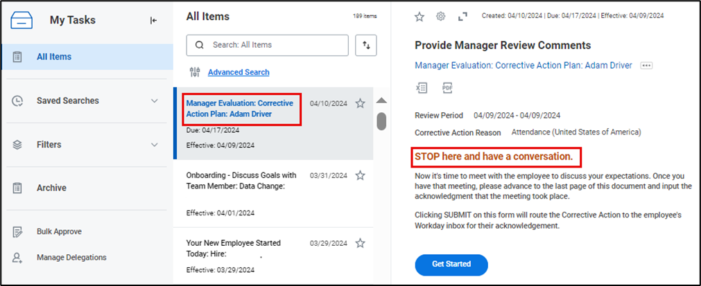 - After you have the meeting with your employee, come back to the task and click Get Started.