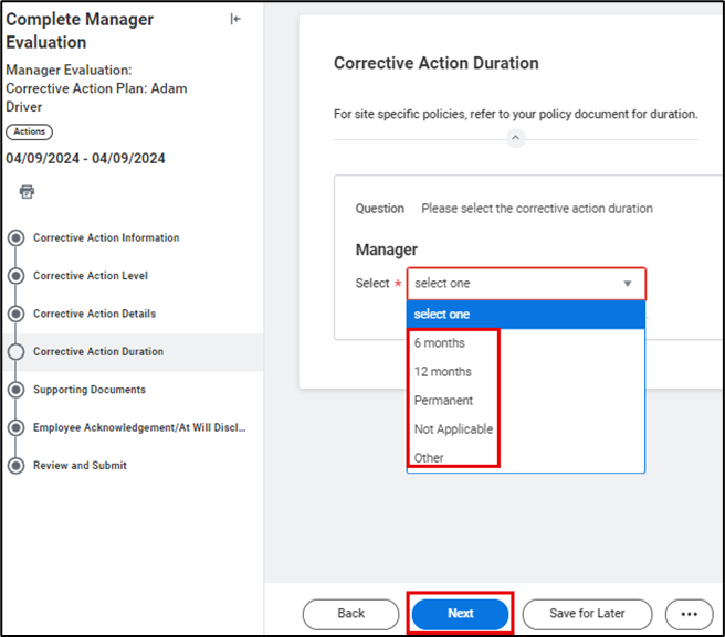 - Enter the Corrective Action Duration (6 months, 12 months, Permanent, Not Applicable or Other). Then, click Next.