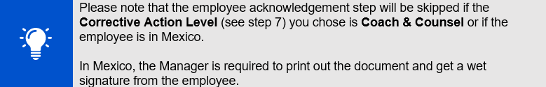 Note that only Written Warning and Final Written Warning levels will trigger an employee acknowledgement step at the end of the corrective action process.