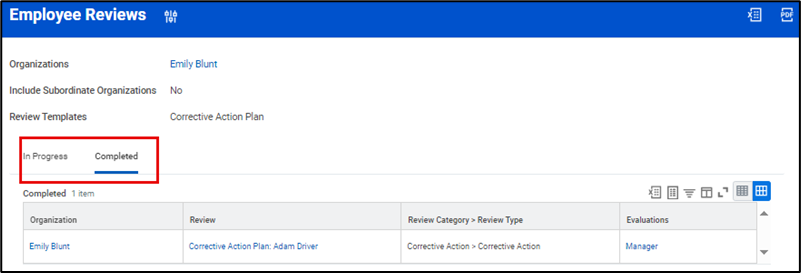 - On the following screen, you will see all In Progress and Completed Corrective Action Plans for your employees. You can toggle between the In Progress and Completed tabs to see the status of the plans.