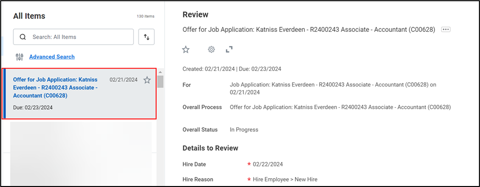 - After the recruiter submits the offer details, it will be routed to you for your approval before it is sent to the candidate. Select the task in your Workday My Tasks Inbox titled Offer for Job Application with the candidate’s name.