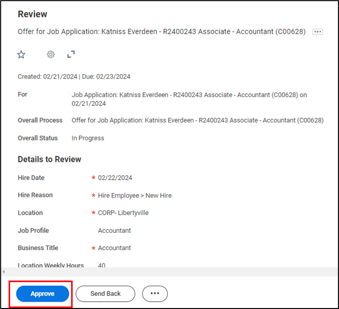 - They can choose to either Approve or Send Back. If they approve, the next step will route to the recruiter to generate a document for offer.
