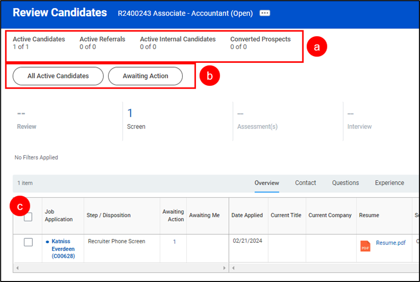 - View the number of Active Candidates, Active Referrals, Active Internal Candidates, or Converted Prospects.