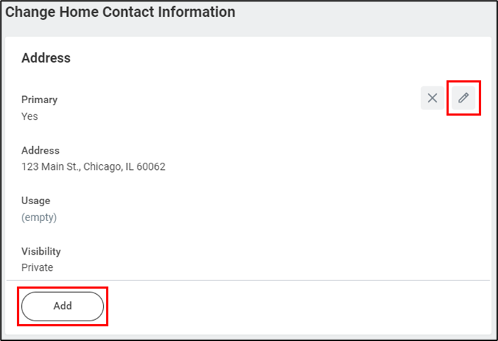 - On the following page, click the Edit icon () or the Add button to update your information. Note that Address, Email and Phone Number are required.