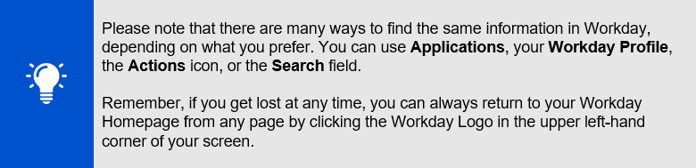 An Application is a compact report displayed as a “tile” on a Workday page, providing easy access to tasks and information you use on a regular basis. You can think of an application like the icons on your computer, tablet, or smartphone that you use to load a program or application.