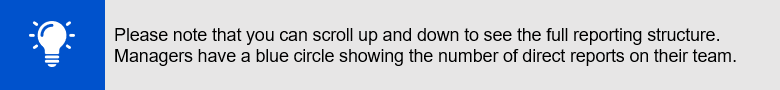 - Once selected, the Org Chart will show you a hierarchical overview, including your direct reports, peer colleagues and supervising Manager.