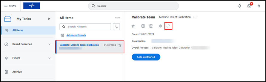 - To view and complete a task, click the task on the left-hand side of your My Tasks Inbox. The task will open on the right-hand side of the screen. Click on the Expand icon () in the top of the page for easier viewing. In the example below, you would click Let’s Get Started to begin the task.