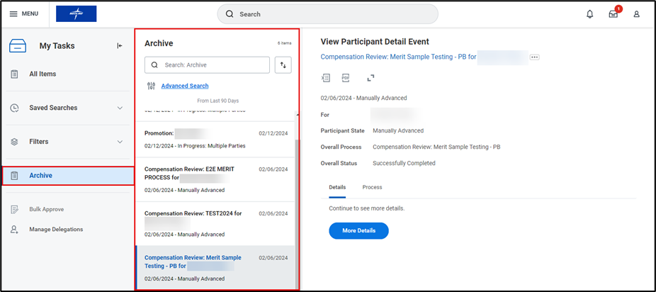 - To view an archived task, click the task on the left-hand side of the screen. It will open on the right-hand side of the screen. Again, you can click the arrows () to expand the screen. You can also see the overall status of various processes, for example if they are Successfully Completed or Canceled.