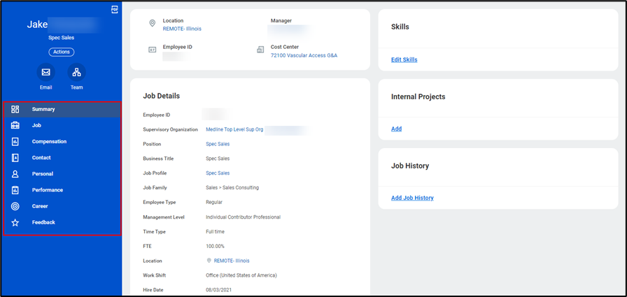 - On the Workday Profile, you can view information specific to that employee. The information you will be able to see depends on your relationship with the employee. For example, if you manage that employee, you will be able to see Job, Compensation, Contact, Personal, Performance, Career and Feedback information related to them. However, if you navigate to your Manager’s Workday Profile, for example, you will only be able to see their Job information.
