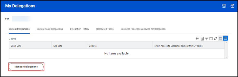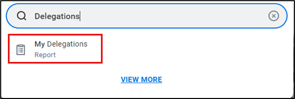 - To get started, type Delegations into the Search Bar and select My Delegations from the drop-down menu.
