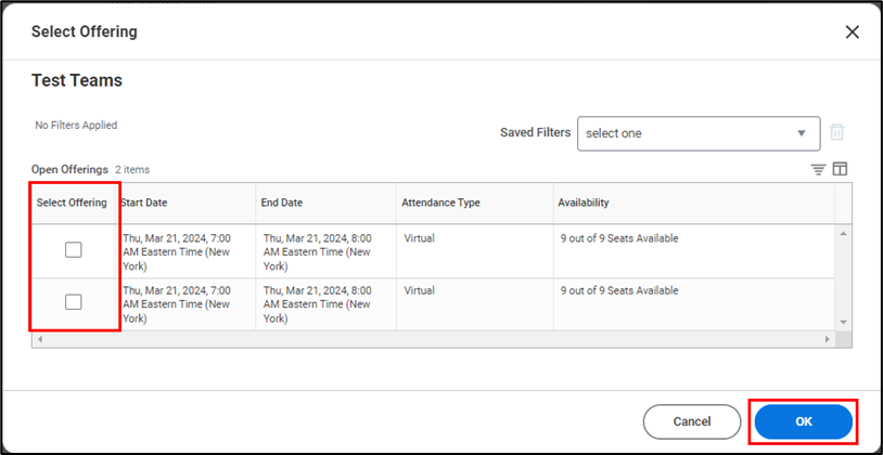 - In the pop-up window that appears, review the Open Offerings information such as the Start and End Date, the Attendance Type and Availability. Select a course offering by clicking on the checkbox and click OK.