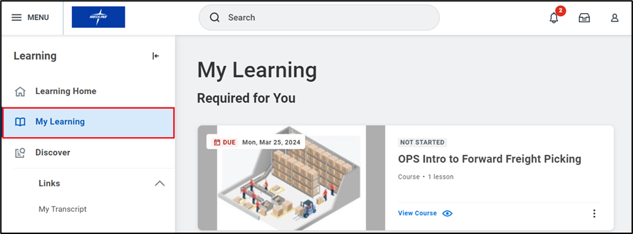 - To view a Required course, click on the Learning Home tab from the navigation panel on the left-hand side of your screen. Your required courses will show up under the Required for You section.