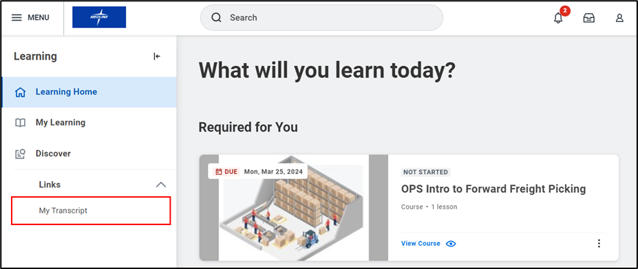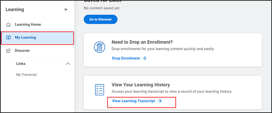 - Alternatively, you can click My Learning. Scroll down and select View Learning Transcript under View Your Learning History.