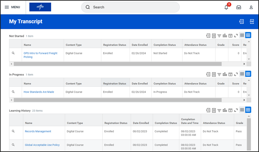 Viewing Learning History and Transcript