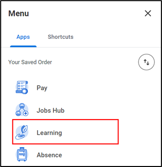 - To get started, click on the learning application from the applications menu at the top left-hand corner of your workday homepage.