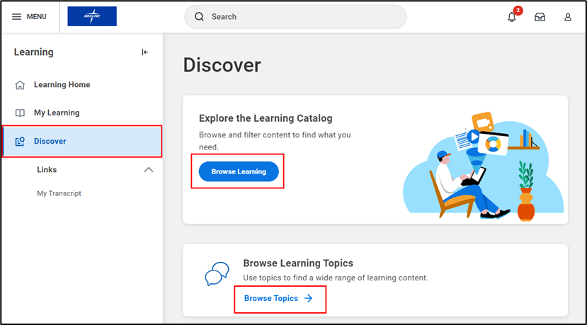 - Next, click Discover from the navigation panel on the left-hand side of your screen. To find a course to enroll in, you can Browse Learning or Browse Topics to find a wide range of learning content. You can also browse Most Popular or Recently Added courses.