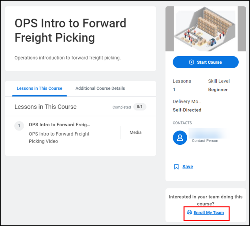 - Click on the Course name to see additional details and to enroll your direct reports. Once you have clicked on a course, you can enroll your direct reports by selecting Enroll My Team.