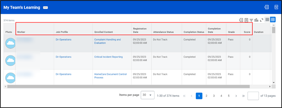 - Next, you will see a report that identifies which courses your direct reports are currently enrolled in or have completed. You’ll be able to the Grade and Score and additional information such as Registration Date and Attendance Status.