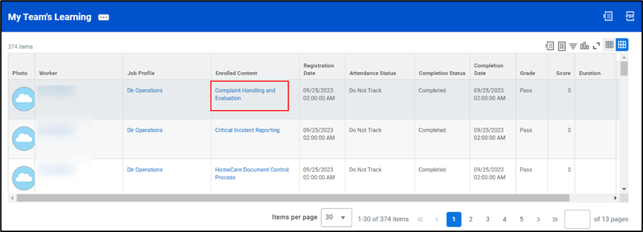 - Next, you will see a report that identifies which courses your direct reports are currently enrolled in or have completed. You’ll be able to the Grade and Score and additional information such as Registration Date and Attendance Status.