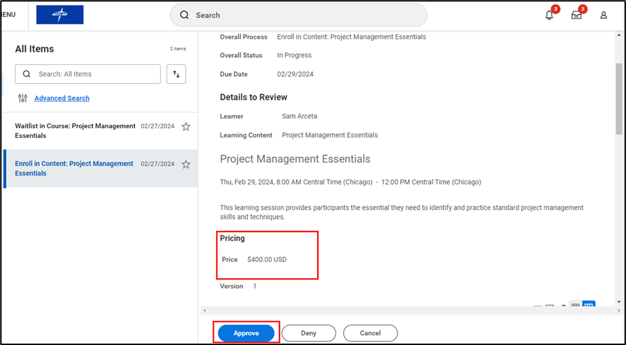 - Carefully review the details of the course, including the Price. To approve the course, click Approve.