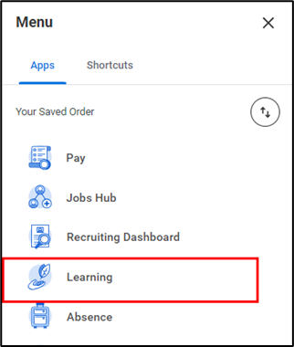 - To get started, click on the Learning application from the applications Menu at the top left-hand corner of your Workday Homepage.