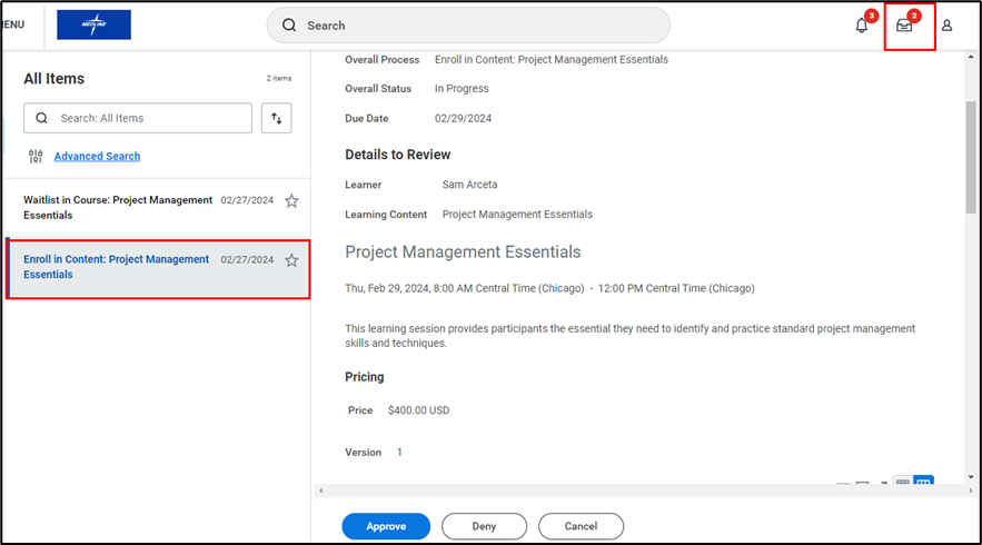 - As a Manager, you may be required to provide approval for your direct reports to take certain courses. Navigate to your Workday My Tasks Inbox and select the task titled Enroll in Content.