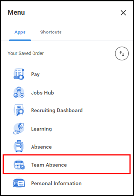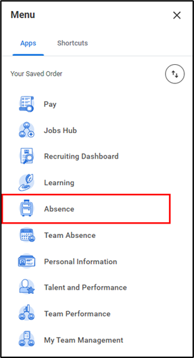 - From your Workday Homepage, click the Menu icon in the top left-hand corner of the screen. Select the Absence application.