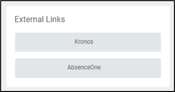 - Here you will see the External Links for the absence management systems: Kronos and AbsenceOne. Click the tile to be directed to the applicable external system.