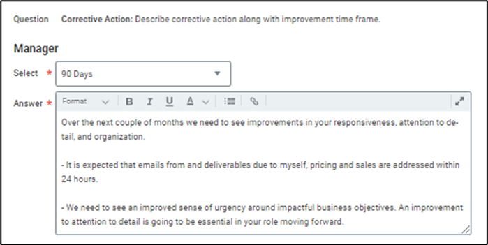 - Performance Commentary: Ensure the Manager provides overall commentary of the employee’s performance, stating the role and high-level expectations / responsibilities of the role that the employee is in, followed by 1-2 sentences indicating where the employee may not be meeting these expectations.