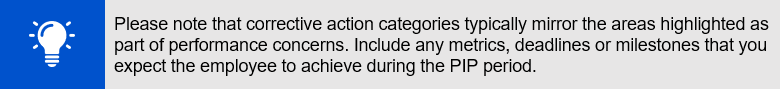- Specific Performance Concerns: Ensure the Manager has stated 2 or 3 categories of performance concerns, providing at least 1 recent example of a task or situation where a performance expectation was not met to support each category or concern listed. Also ensure they have included any negative impact to the department or business and have highlighted any coaching that may have already been provided thus far.